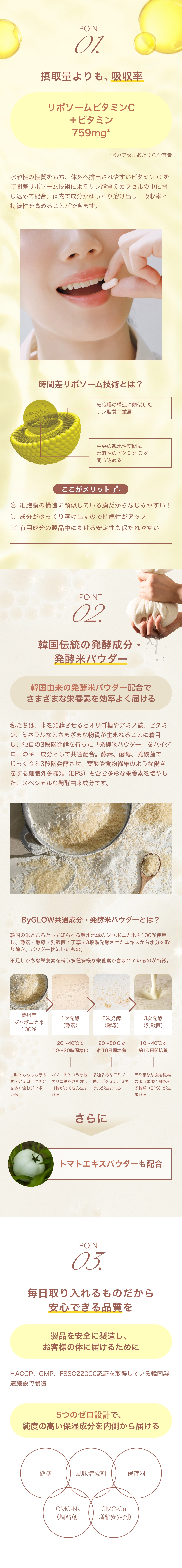 コーンスターチ、イソマルト、ナタネ油、酵母エキス、発酵米パウダー、トマトエキスパウダー/ビタミンC、ヒドロキシプロピルメチルセルロース、カラギナン、着色料(二酸化チタン、黄4、黄5)、ソルビタン脂肪酸エステル、塩化マグネシウム、グリセリン、塩化カリウム、L-シスチン